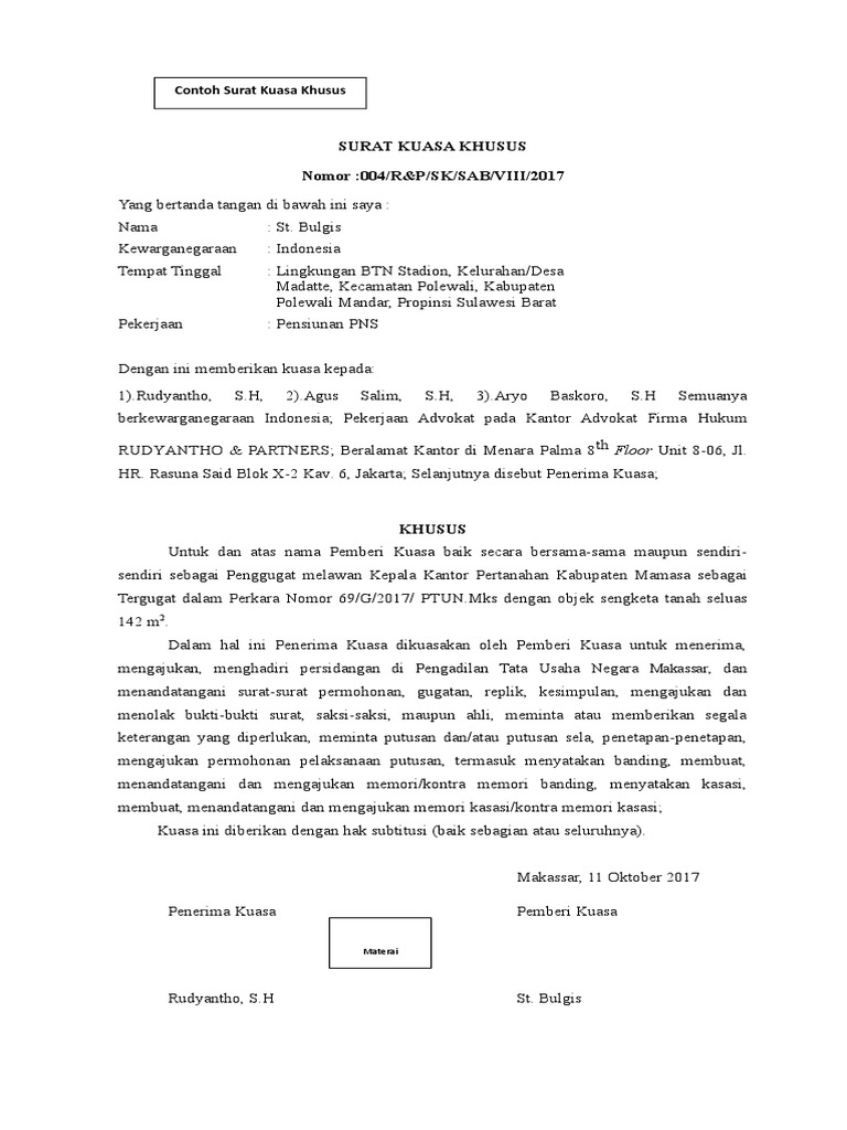 Contoh surat kuasa adalah surat yang didalamnya berisikan pemberian kuasa kepada seseorang yang telah dipercaya. Surat kuasa perseorangan ialah surat kuasa yang di buat seseorang untuk orang yang dipercaya dalam hal menyelesaikan kepentingan pribadi pada gambar contoh di atas surat kuasa khusus pidana tersebut di berikan oleh terdakwa yudi setiawan kepada empat pengacara yang berasal dari. Pengaturan mengenai surat kuasa khusus diatur dalam pasal 1975 bw, yakni mengenai. Dengan demikian isinya menjelaskan secara terperinci tindakan apa saja yang bisa dilakukan penerima kuasa terkait dengan penunjukannya tersebut. Apabila surat kuasa dibuat untuk kepentingan keuangan, seperti untuk mengambil upah atau gaji, sebaiknya menyerahkan kuasa kepada pihak khusus untuk surat kedinasan, harus ditambahkan stempel lembaga atau instansi terkait.