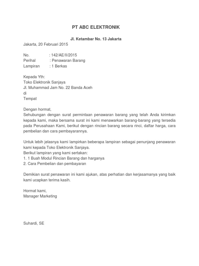 Contoh surat niaga penawaran jasa. Dalam berbisnis ada berbagai macam aspek yang bisa membuat seseorang sukses. Ada banyak perusahaan sekarang ini yang bergerak di bidang produksi barang atau produk. Baik itu kepada retailer atau penjual eceran maupun end user atau pengguna akhir. Pangeran wijil no 221 surakarta. Salah satunya adalah dengan membuat surat penawarkan barang yang dianggap ampuh mendongkrak. Itulah mengenai contoh surat niaga dalam berbagai hal. Surat niaga penawaran barang tersebut memuat informasi mengenai daftar barang dan juga harga yang. Dan tentu saja keinginan mereka adalah salah satunya untuk menjual barang sebanyak mungkin. Bersama surat ini perkenankan kami memberikan penawaran berbagai alat dan barang yang akan siap kami pasok ke depannya dan besar harapan kami supaya permohonan ini dapat diterima dan dapat di acc. Dalam surat penawaran akan tertulis harga dan kuantitas barang yang ditawarkan. Perdagangan memang sesutu yang sangat serius dan dijalani dengan benar sesuai prosedur, apalagi yang perdagangannya sudah kelas atas yang. Contoh surat penawaran barang #1.