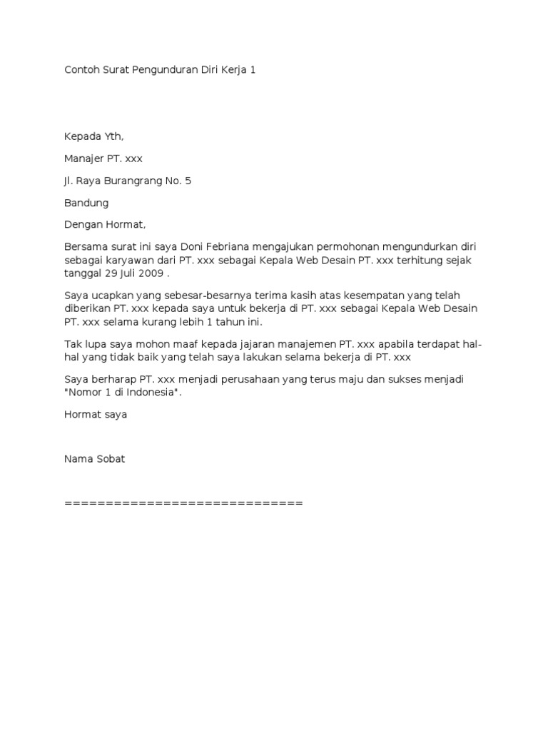 Berikut contoh surat pengunduran diri kerja yang baik: Dalam dunia kerja, akan ada saat dimana kita harus. Surat ini bisa dibuat dengan cara tulis tangan atau diketik dengan komputer. Dalam membuat surat pengunduran diri ini sangatlah penting untuk memperhatikan aturannya. Surat pengunduran diri kerja atau resign letter adalah surat pernyataan bahwa seseorang mengundurkan diri dari pekerjaannya dengan suatu alasan tertentu. Terkadang ada banyak hal disaat kita bekerja di sebuah perusahaan atau instansi yang membuat kita. Bekerja merupakan kegiatan setiap orang setelah menempuh pendidikan. Entah bagi yang ingin resign dari tempat kerja di perusahaan yang selama ini ia bernaung di bawahnya atau dari jabatan tertentu. Seperti apa contoh surat mengundurkan diri yang baik dan benar agar tetap menjaga kesan baik di perusahaan. Juli 15, 2020 september 4, 2020 / tips bekerja. Untuk membuat surat pengunduran diri kerja, ada beberapa poin yang harus diperhatikan mulai dari format penulisan, komponen informasi yang dicantumkan, dan tata cara bagimana cara reasign yang baik dan benar. Berikut adalah beberapa contoh surat pengunduran diri kerja yang baik dan benar, semoga bisa menjadi bahan referensi untuk anda. Surat pengunduran diri dari pekerjaan memang ditujukan untuk menyatakan jika anda ingin memutuskan ikatan kerja dengan perusahaan yang telah anda.