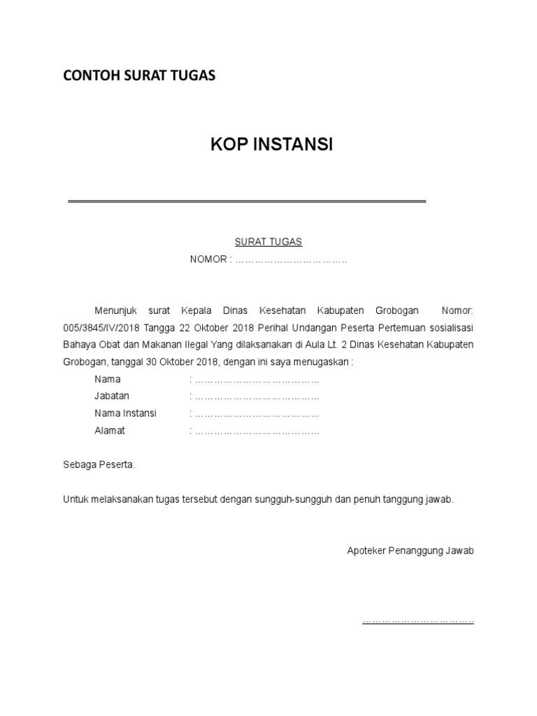 Contoh surat tugas menjadi salah satu jenis surat resmi walaupun dalam pemakaian bersifat internal (hanya pada lingkup instansi/ lembaga). Biasannya surat ini dibuat oleh suatu instansi baik swasta maupun negri seperti sekolah, kantor pemerintahan maupun perusahaan swasta. Surat tugas adalah surat resmi yang di buat dan di keluarkan oleh seorang yang berwenang dalam suatu lembaga atau instansi tertentu. Contoh surat tugas penanggung jawab acara. Berikut ini merupakan contoh surat tugas ✅ seperti surat dinas, guru, kerja, perusahaan, pelatihan dan organisasi ✅. Anda kesulitan dalam menyusun atau membuat surat ini. Namun, sebenarnya keduanya kedua surat ini memiliki perbedaan. Demikian surat tugas ini diberikan untuk segera dilaksanakan, atas perhatian bapak/ibu disampaikan terima kasih. Mulai dari surat tugas guru, surat tugas karyawan, hingga surat tugas dinas lainnya. Itu tadi penjelasan singkat mengenai contoh surat tugas dinas. Contoh surat dinas merupakan sebuah contoh surat resmi yang memuat berbagai hal yang menggunakan susunan dan sistem penulisan yang formal. Berikut kami berikan beberapa contoh surat tugas yang dapat anda gunakan sebagai referensi. Perbedaannya adalah surat tugas hanya.