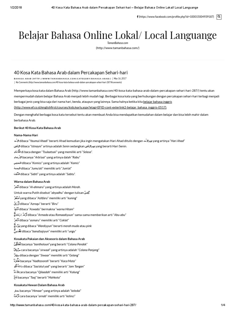 Mempelajari bahasa arab dan memperkaya kosa kata dalam bahasa arab tentu akan mempermudah dalam belajar bahasa arab menjadi lebih mudah lagi. Kata serapan dalam bahasa indonesia merupakan kata yang semula berasal dari bahasa asing, kemudian diserap dan menjadi bagian dari bahasa indonesia. Laa haula wa laa quwwata illa billah لاَ حَوْلَ وَلاَ قُوَّتَ اِلاَّبِاللّهِ. Dalam bahasa arab, kata dibagi menjadi 3, yaitu isim ( اسم ), fi'il ( فعل ) dan harf ( حرف). Semoga kita tetap istiqomah menuntut ilmu arab hingga maut menjemput. Cara menjawabnya dan yang utama dalam menjawab kalimat yang bagus ini adalah dengan mengulang kalimat tersebut yakni membalasnya dengan mengatakan : Hitungan dalam bahasa arab disebut 'adad (عدد) dan yang dihitung disebut dengan m'adud (معدود). Langsung saja di bawah ini kami sajikan kosakata atau nama nama hari dalam bahasa arab yang lengkap dengan artinya. Nah itulah bahasa arabnya jam sudah kita ketahui bersama pada tulisan di atas, berikutnya akan kami sampaikan juga kosakata tentang jam atau waktu yang menunjukan pukul. Namun kalimat bahasa arab dengan struktur spo atau spok pun masih dibenarkan secara kaidah, seperti contoh jumlah ismiyyah nomor 3, 4, 6, 7, 8, 9, 10, 16, 18, 19, dan 20. Buatlah 5 kalimat bahasa arab dalam kehidupan sehari hari. Selain ekspresi di atas, ada lagi contoh ungkapan lainnya ketika kita bertemu/salam dalam bahasa arab, yaitu kosakata bahasa arab tentang kelas dan peralatan sekolah serta contoh kalimatnya. Dalam bahasa apapun, termasuk bahasa arab, pola kalimat adalah salah satu hal yang penting dibahas.